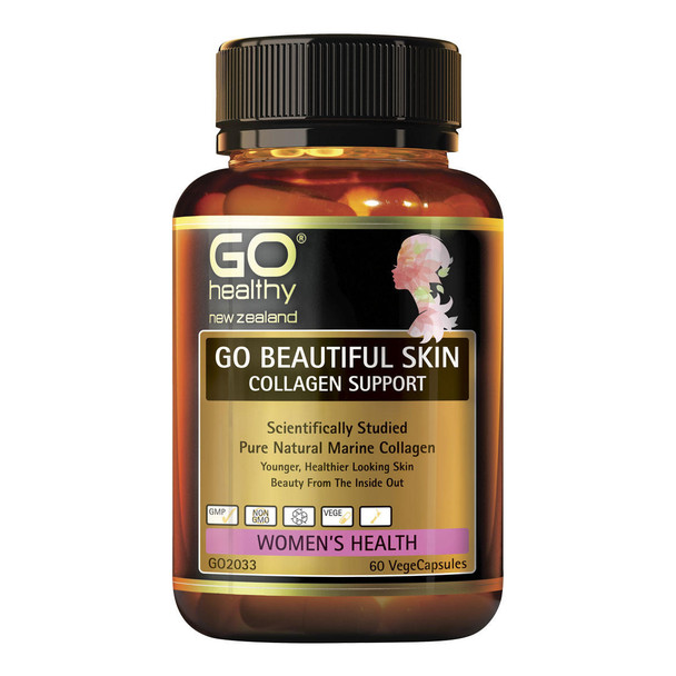 GO Healthy Go Beautiful Skin Collagen Support contains scientifically studied Collactive® natural marine collagen to help support beauty from the inside out.